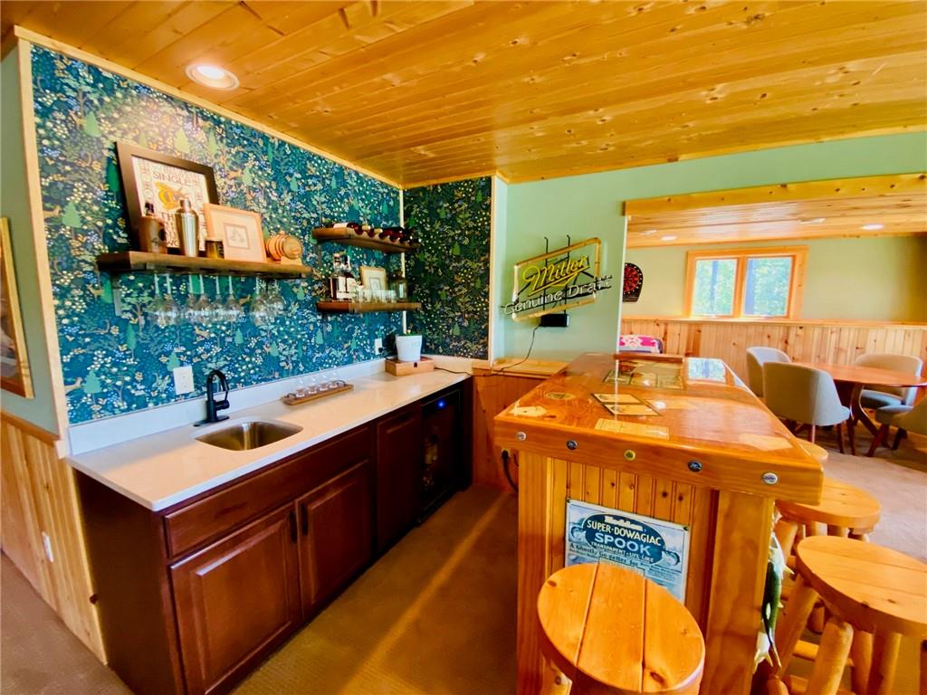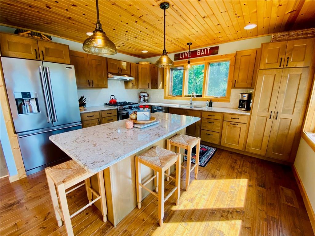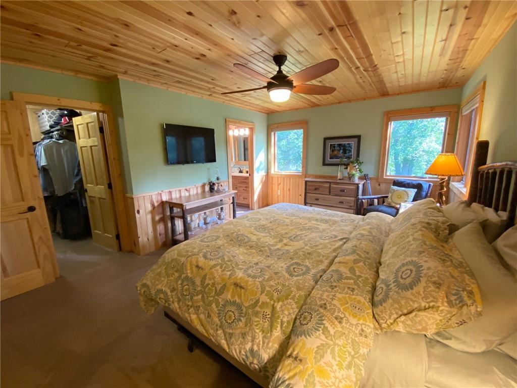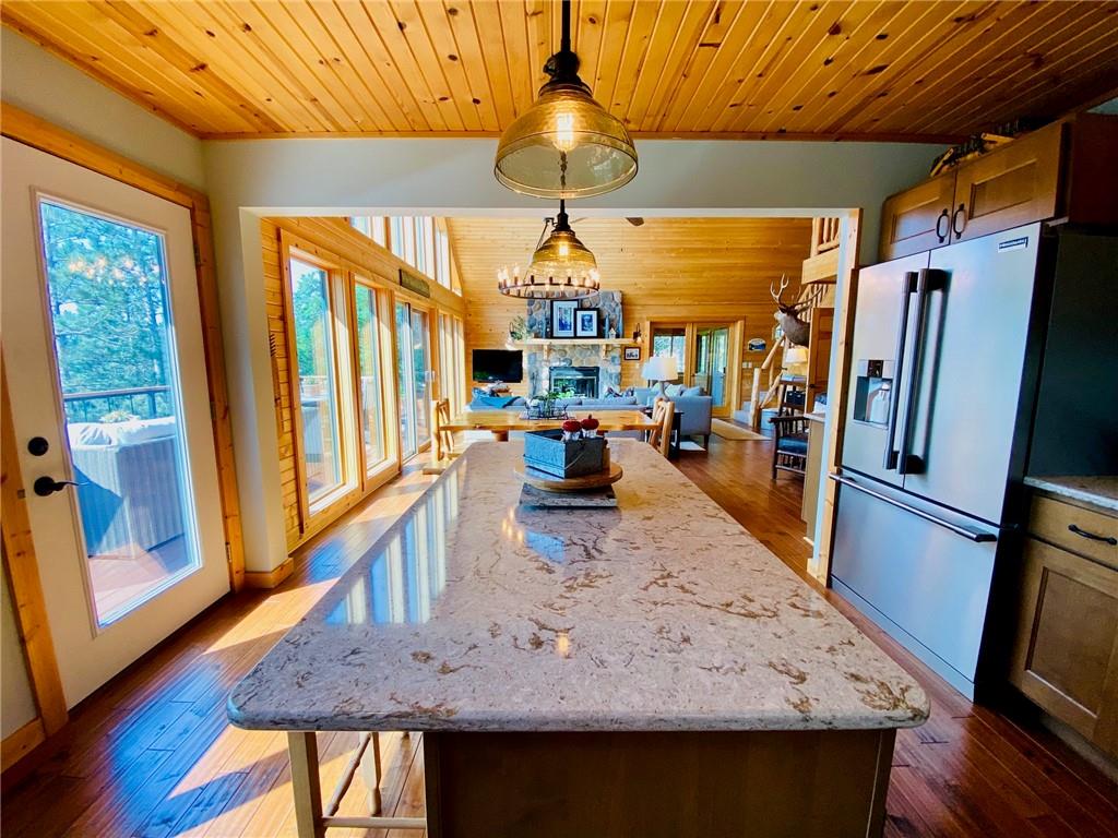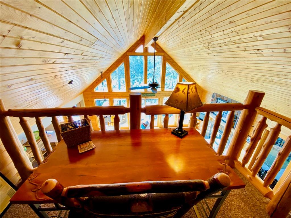 High-end, custom-built chalet-style home on the popular Minong Flowage! This 5BR/3BA retreat offers quality craftsmanship throughout with hand-scraped maple floors, cedar siding, and a stunning wall of lakeside windows that flood the interior with natural light. Major remodeling and addition completed in 2017. The spacious layout includes multiple living areas, ample storage, a large primary en suite with walk-in closet, and a fully finished walk-out basement perfect for guests or entertaining. Professional-grade appliances, a full backup generator system, and meticulous maintenance make this home truly turn-key. A detached 2-car garage with loft for storage or potential guest quarters. The nicely landscaped, level yard offers great privacy, while a floating dock and deep-water boat lift provide premium lake access. Located on a prime spot on this sought-after lake with boat-up restaurants and bars nearby. Near recreation trails for ATVing, snowmobiling, hiking, and four-season fun!